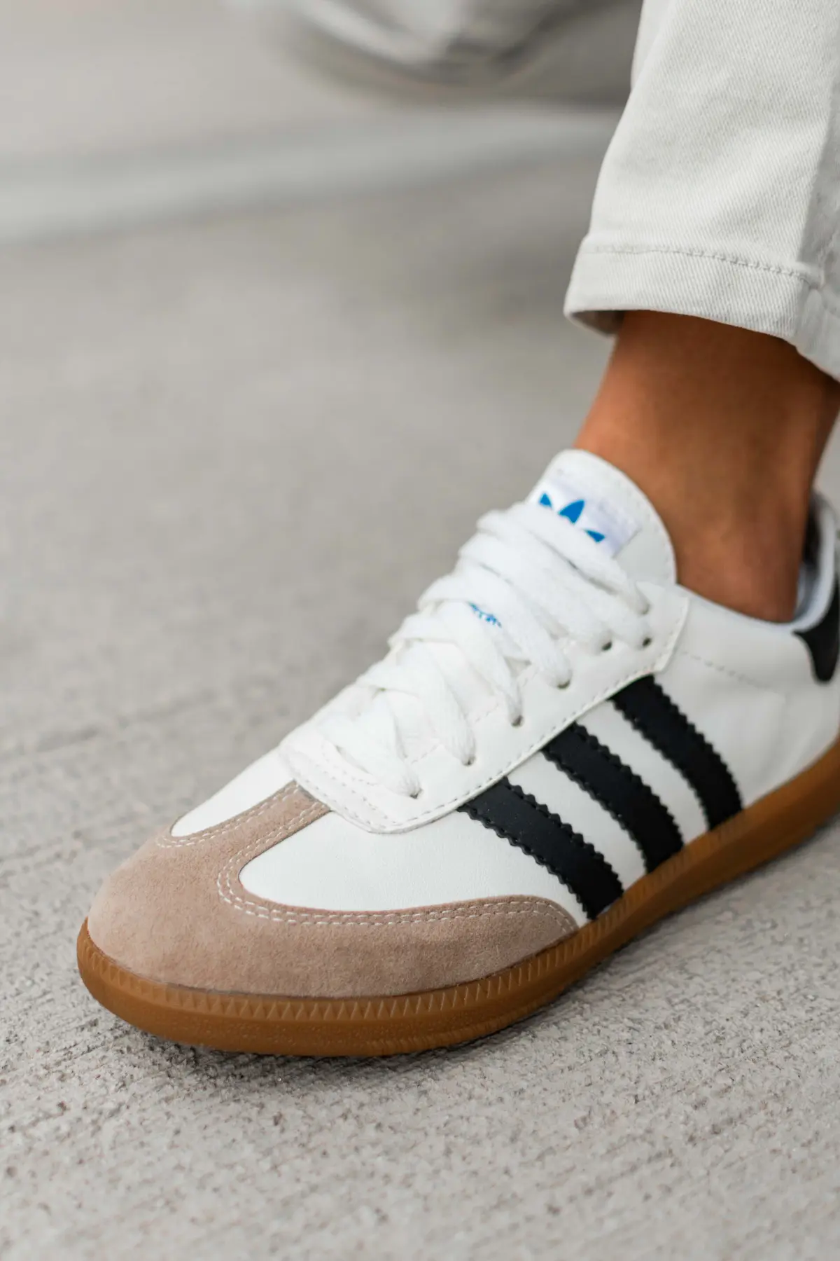 Revive el estilo de un ícono. Las zapatillas Adidas Samba, un clásico que nunca pasa de moda, se presentan en una elegante combinación de colores. Su parte superior de blanco puro y nítido se realza con las legendarias tres franjas en negro intenso, creando un contraste audaz y atemporal. La distintiva puntera en forma de T, hecha de suave gamuza en un tono tierra, no solo evoca su herencia deportiva, sino que también añade una textura sofisticada. Todo el diseño se asienta sobre la inconfundible suela de goma caramelo, conocida por su agarre y su inigualable toque retro. Un sutil logo azul en la lengüeta completa este calzado, perfecto para quienes buscan combinar la historia del deporte con un estilo urbano y contemporáneo.